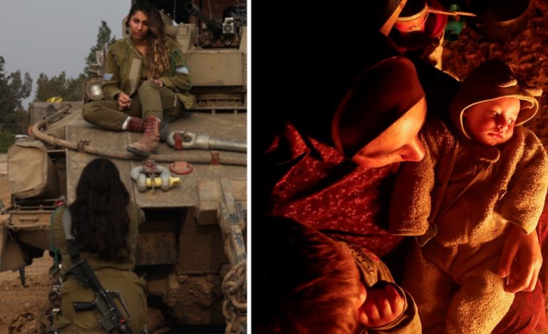 Δύο Ισραηλινές ένστολες αράζουν σε ένα τεθωρακισμένο όχημα μεταφοράς προσωπικού (APC) στο νότιο Ισραήλ, 28 Δεκεμβρίου 2023 (REUTERS/Violeta Santos Moura). Κάτω μια εκτοπισμένη Παλαιστίνια αράζει δίπλα σε φωτιά την Πρωτοχρονιά σε καταυλισμό κρατώντας πιθανόν, τα παιδιά της, (REUTERS/Mohammed Salem).