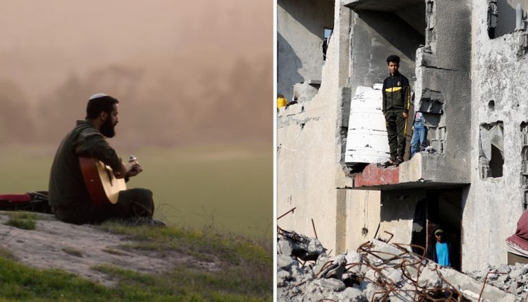 Ένας Ισραηλινός στρατιώτης παίζει κιθάρα σε έναν λόφο κοντά στα σύνορα Ισραήλ-Γάζας, 27 Δεκεμβρίου 2023. (REUTERS/Amir Cohen). Δεξιά, Παλαιστίνιοι στέκονται σε ένα σπίτι που καταστράφηκε από ισραηλινό χτύπημα, 1 Ιανουαρίου 2024. (REUTERS/Ibraheem Abu Mustafa)