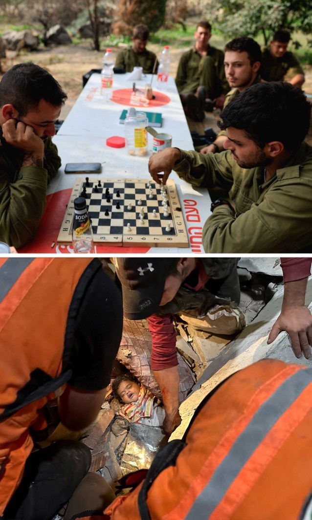 Πάνω, Ισραηλινοί στρατιώτες παίζουν σκάκι κοντά στα σύνορα Ισραήλ-Γάζας, 27 Δεκεμβρίου 2023 (REUTERS/Amir Cohen) και κάτω διασώστες βοηθούν να ανασύρουν ένα Παλαιστίνιο μωρό παιδί που έχει τραυματιστεί παγιδευμένο στα ερείπια ενός σπιτιού μετά από επιδρομή συναδέλφων των σκακιστών στη Ράφα, 28 Δεκεμβρίου 2023 (REUTERS/Fadi Shana).