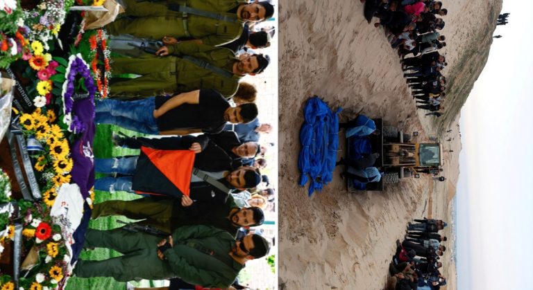 Μαζική «κηδεία» -στην πραγματικότητα μακάβριο θάψιμο-Παλαιστινίων που σκοτώθηκαν από ισραηλινά χτυπήματα και πυρά, αφού τα πτώματά τους απελευθερώθηκαν από το Ισραήλ, Δεκέμβριος 26, 2023 (REUTERS/Ibraheem Abu Mustafa). Κάτω φίλοι και οικογένεια θρηνούν στην κηδεία στο Τελ Αβίβ, τον Ισραηλινό έφεδρο Λοχία Κωνσταντίν Σούσκο, που σκοτώθηκε στη Γάζα κατά τη διάρκεια της συνεχιζόμενης ισραηλινής επιχείρησης στη Λωρίδα της Γάζας, Ισραήλ, 1 Ιανουαρίου 2024 (REUTERS/Clodagh Kilcoyne).
