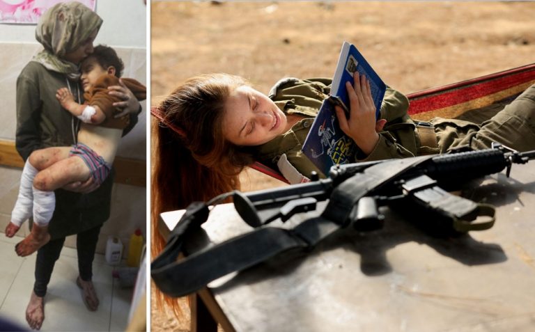 Αριστερά, μια Παλαιστίνια κρατά ένα παιδί τραυματισμένο μετά από ισραηλινό χτύπημα, σε νοσοκομείο στο Khan Younis, στη νότια Λωρίδα της Γάζας, 28 Δεκεμβρίου 2023 (REUTERS/Ahmed Zakot). Μια μέρα πριν, στις 27 Δεκεμβρίου ο φακός «αιχμαλώτισε» μια Ισραηλινή ένστολη να χαλαρώνει χαμογελαστή διαβάζοντας το βιβλίο της έχοντας δίπλα το όπλο της. (REUTERS/Amir Cohen).