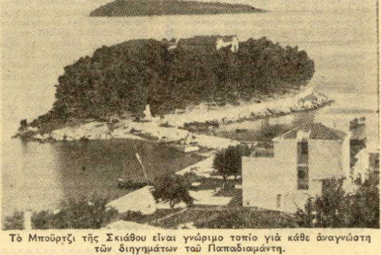 Στη Σκιάθο ζη πάντα ο Αλέξανδρος Παπαδιαμάντης. Το σπίτι του δεν είναι —όπως θάπρεπε— τέμενος της πνευματικής Ελλάδος. Πατώντας κανείς το πόδι του στο γραφικό Μπούρτζι, ένα καταπράσινο νησάκι δεμένο σήμερα με το μουράγιο, αντικρύζει τη στοχαστική και θλιμμένη μορφή του συγγραφέα πάνω σε μια πέτρινη στήλη, ενώ θάπρεπε να υψώνεται μια σύνθεση ή μια προτομή ανάλογης καλλιτεχνικής αξίας —και προ παντός ανάλογης εμπνεύσεως— με το δικό του έργο. Ζη όμως και θα βρίσκεται παντοτινά στ’ ακρογιάλια του νησιού, στις ρεματιές, στα ξωκκλήσια του. Πλανιέται πάνω απ’ τα κύματα και η σκιά του πέφτει στις τοποθεσίες που χαράχτηκαν ανεξίτηλα στις σελίδες του. Πάντως, αν δεν έχης γευθή το έργο του Παπαδιαμάντη, δεν μπορείς να χαρής πραγματικά τη Σκιάθο.