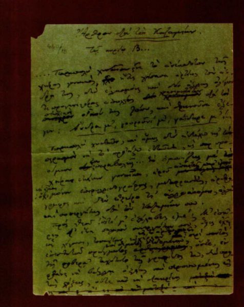 Στην κεντρική φωτογραφία του παρόντος άρθρου, ο Αλέξανδρος Παπαδιαμάντης διά χειρός Νίκου Εγγονόπουλου.