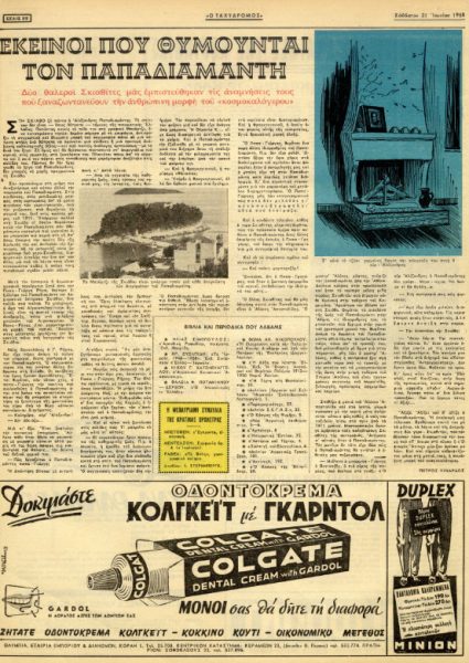 *Άρθρο του διακεκριμένου δημοσιογράφου και συγγραφέα Πέτρου Λινάρδου (1925-2022) για τον Αλέξανδρο Παπαδιαμάντη, που έφερε τον τίτλο «Εκείνοι που θυμούνται τον Παπαδιαμάντη» και είχε δημοσιευτεί στο τεύχος του «Ταχυδρόμου» που είχε κυκλοφορήσει το Σάββατο 21 Ιουνίου 1958.