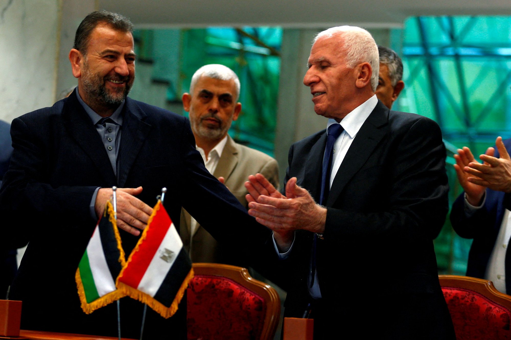 Ο επικεφαλής της αντιπροσωπείας της Χαμάς Σάλεχ Αλ-Αρούρι και ο ηγέτης της Φατάχ Azzam Ahmad υπογράφουν συμφωνία συμφιλίωσης στο Κάιρο, 12 Οκτωβρίου 2017. (REUTERS/Amr Abdallah).