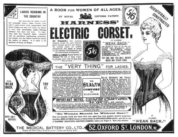 Σαν να μην ήταν αρκετά κακοί οι κορσέδες, έρχεται η επιστήμη να τους κάνει ακόμα χειρότερους. Η κυρία Whiting, που υπέφερε μια ζωή από δυσκοιλιότητα, ήταν » πολύ καλύτερα » χάρη σε αυτόν τον ηλεκτρικό κορσέ. Τα σαγηνευτικά ψιλά γράμματα υπόσχονται ότι «το στήθος υποβοηθείται στην υγιή ανάπτυξή του», κάνοντάς το να ακούγεται σαν κάτι που θα προσπαθούσε να σας πουλήσει μια influencer στο TikTok. Ο ηλεκτρικός κορσές προερχόταν από το 52 Oxford Street του Λονδίνου, το οποίο σήμερα είναι ένα Holland & Barrett.