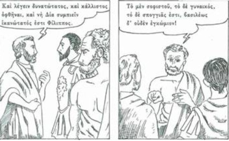 «φύσει δ᾽ υπάρχει τοις παρούσι τα των απόντων» (στο μεταφρασμένο κείμενο: «εκ φύσεως η περιουσία των απόντων ανήκει στους παρόντες») και «εγώ μεν γαρ οίομαι τοις ελευθέροις μεγίστην ανάγκην την υπέρ των πραγμάτων αισχύνην είναι» (στο μεταφρασμένο κείμενο: «Εγώ τουλάχιστον νομίζω ότι ο μεγαλύτερος εξαναγκασμός για ελεύθερους ανθρώπους είναι το αίσθημα της ντροπής για την κατάστασή τους»).