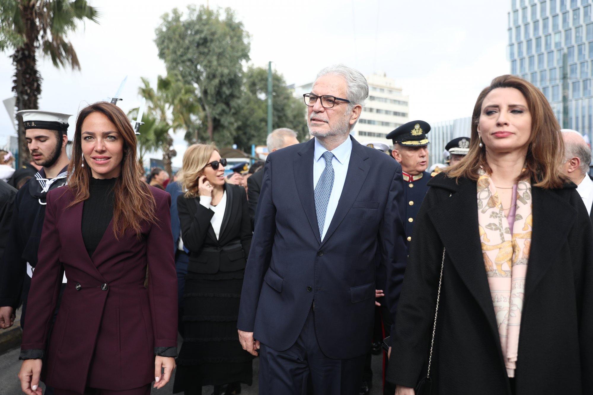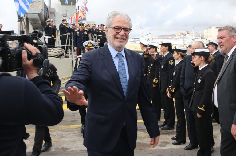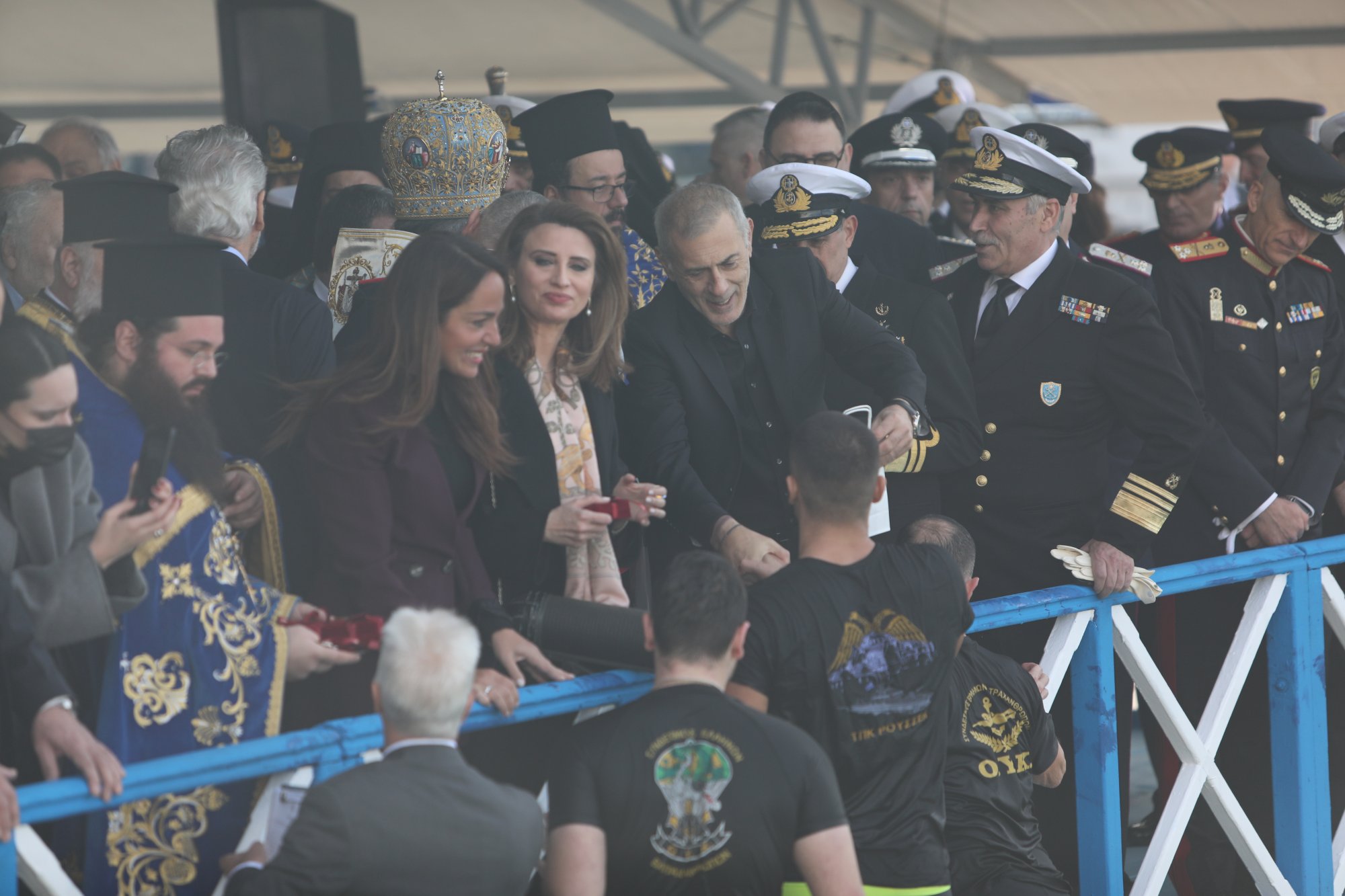 Ο υπουργός Ναυτιλίας Χρήστος Στυλιανίδης (Κ), ο αρχηγός ΓΕΕΘΑ Κωνσταντίνος Φλώρος (Δ) και ο δήμαρχος Πειραιά Γιάννης Μώραλης (Α)