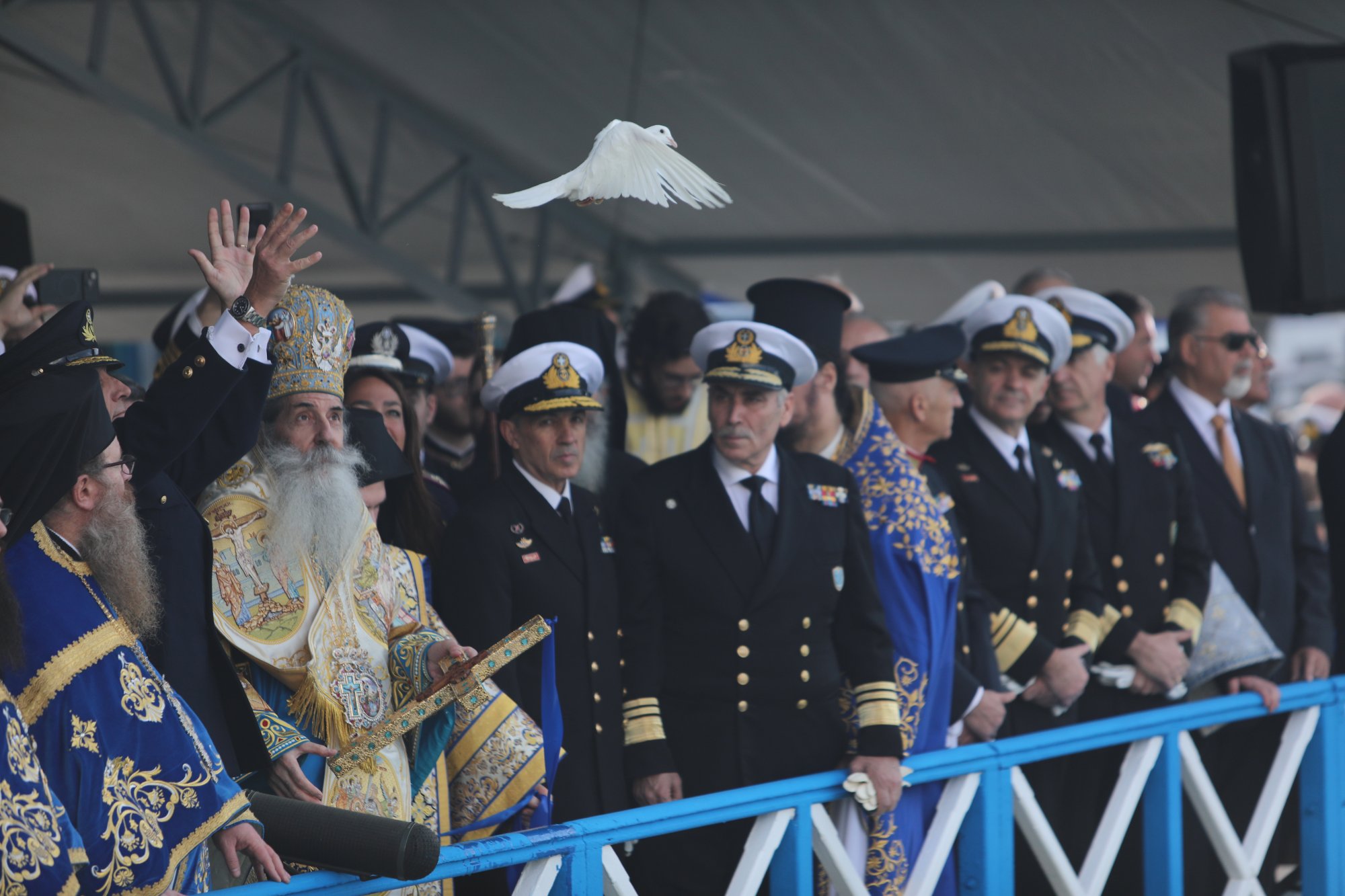 Τα τρία περιστέρια ελευθέρωσαν στον ουρανό ο υπουργός Ναυτιλίας Χρήστος Στυλιανίδης, ο αρχηγός ΓΕΕΘΑ Κωνταντίνος Φλώρος και ο πρώτος πολίτης της Πόλης ο δήμαρχος Γιάννης Μώραλης.