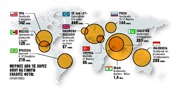 Πράγματι, τη νέα χρονιά θα στηθούν κάλπες σε πάνω από 70 χώρες (εκ των οποίων οι 8 από τις 10 πολυπληθέστερες), με αποτέλεσμα περισσότεροι από 3,1 δισ. πολίτες να καλούνται, με τις επιλογές που θα κάνουν, να βάλουν το δικό τους – μικρό ή μεγαλύτερο – «πετραδάκι» στην πορεία προς το μέλλον, μετέχοντας στις προεδρικές, τις βουλευτικές ή τις περιφερειακές – δημοτικές εκλογές που έχουν προγραμματιστεί.