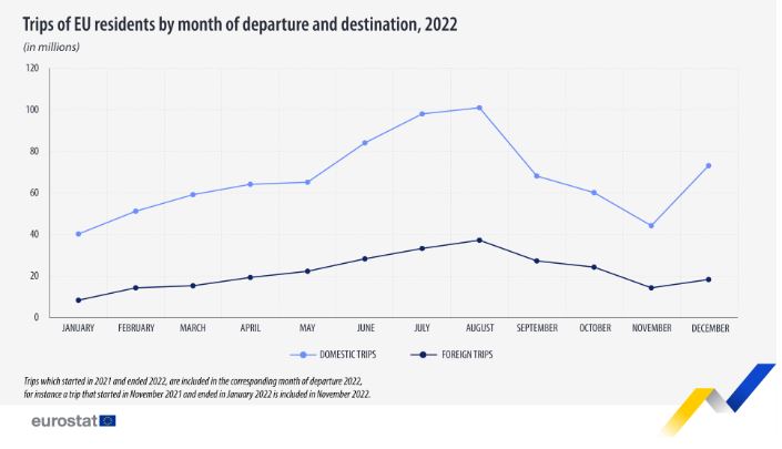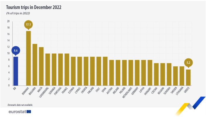 Περίπου 92 εκατομμύρια τουριστικά ταξίδια πραγματοποιήθηκαν από τους κατοίκους της ΕΕ τον Δεκέμβριο του 2022, σύμφωνα με τα στοιχεία της Eurostat. Ο αριθμός αυτός αντιστοιχεί στο 8,6% του συνόλου των ταξιδιών που πραγματοποιήθηκαν κατά τη διάρκεια του εν λόγω έτους.