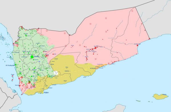 Με το χρώμα της μέντας απεικονίζονται οι περιοχές των Χούθι που υποστηρίζονται από το Ιράν. με ροζ των κυβερνητικών δυνάμεων που υποστηρίζονται από την Σαουδική Αραβία και με το λαδί απεικονίζεται το υποστηριζόμενο από τα ΗΑΕ Νότιο Μεταβατικό Συμβούλιο. Με άσπρο είναι η περιοχή που ελέγχεται από την Αλ Κάιντα της Αραβικής Χερσονήσου. Στον επάνω επικαιροποιημένο χάρτη φάινονται οι αλλαγές με αρκετές διαφιλονικούμενες περιοχές.