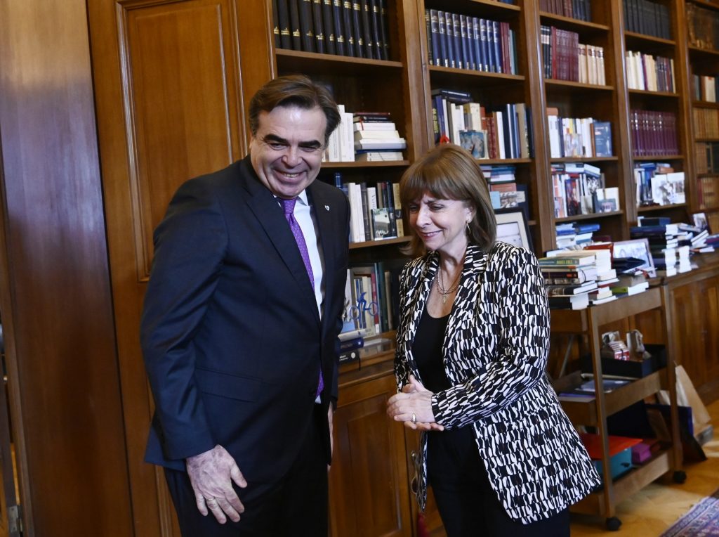 Από την πλευρά της, η Πρόεδρος της Δημοκρατίας Κατερίνα Σακελλαροπούλου, καλωσορίζοντας τον αντιπρόεδρο της Ευρωπαϊκής Επιτροπής, ευχήθηκε το 2024 «να δούμε λύσεις και απαντήσεις της ευρωπαϊκής μας οικογένειας σε μια σειρά από προκλήσεις, που αντιμετωπίζει σε αυτές τις ιδιαίτερα κρίσιμες περιστάσεις, για όλο τον πλανήτη θα έλεγα».