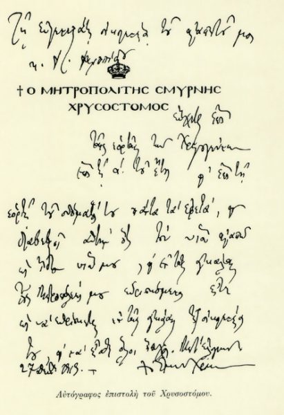 *Απόσπασμα από ομιλία που είχε εκφωνήσει ο σμυρναίος αρχαιολόγος, πανεπιστημιακός δάσκαλος και ακαδημαϊκός Γεώργιος Μυλωνάς (1899-1988) με θέμα «Ο Εθνομάρτυς Χρυσόστομος, Μητροπολίτης Σμύρνης», εξ αφορμής της συμπληρώσεως 60 ετών από τη Μικρασιατική Καταστροφή και τη δολοφονία του φωτισμένου ιεράρχη (πηγή: Πρακτικά της Ακαδημίας Αθηνών).