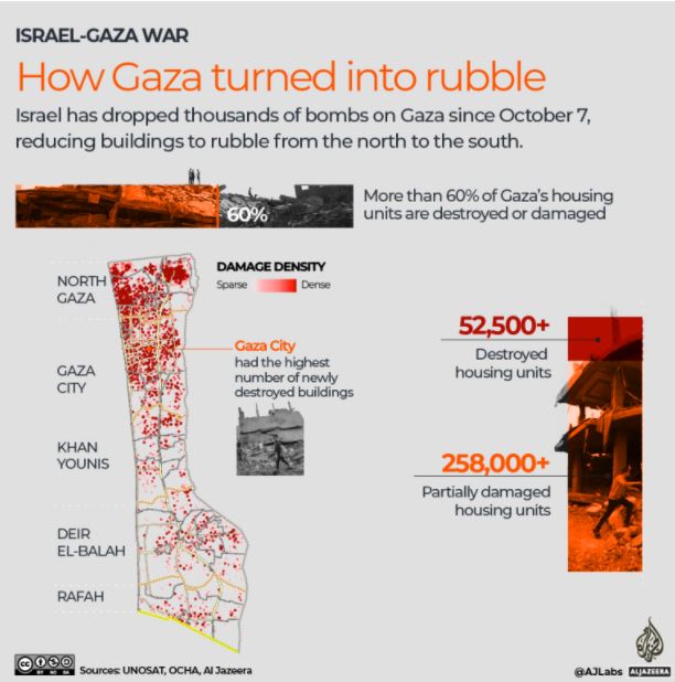 Οι βομβαρδισμοί έχουν καταστρέψει συνοικίες ολόκληρες, εκτοπίζοντας το 85% του πληθυσμού και προκαλώντας τεράστια ανθρωπιστική κρίση, σύμφωνα με τον ΟΗΕ.
