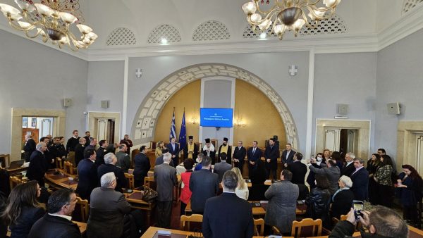 Προηγήθηκε Αγιασμός και κοπή της βασιλόπιτας του Περιφερειακού Συμβουλίου, που τέλεσε ο Μητροπολίτης Ρόδου κκ Κύριλλος.