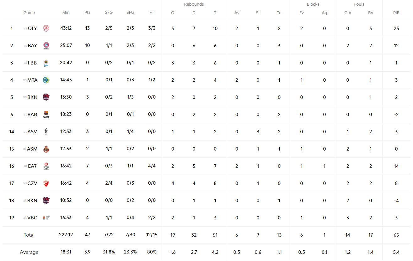 Αξίζει να σημειωθεί πως οι περισσότεροι πόντοι του φέτος σε ματς του Παναθηναϊκού στη Euroleague είναι οι 13 στην πρεμιέρα με τον Ολυμπιακό, όπου έπαιξε 43 (!) λεπτά. Από εκεί και μετά στην επόμενη αγωνιστική με την Μπάγερν έβαλε 10, ενώ στις υπόλοιπες10 αναμετρήσεις έχει 24 πόντους με τρία μηδενικά!