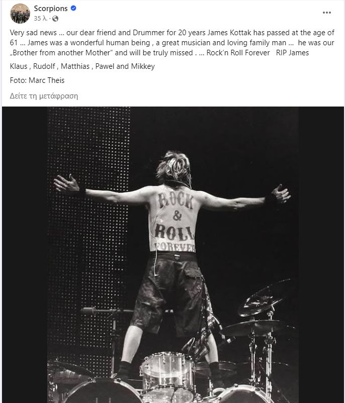 «Πολύ θλιβερά νέα… ο αγαπημένος μας φίλος και ντράμερ επί 20 χρόνια Τζέιμς Κότακ πέθανε σε ηλικία 61 ετών… ο Τζέιμς ήταν ένας υπέροχος άνθρωπος, σπουδαίος μουσικός και τρυφερός οικογενειάρχης», ανέφεραν σε ανάρτηση τα μέλη των Scorpions.