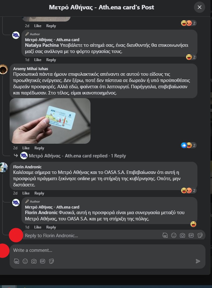 Όπως ο «χρήστης» Florin Andronic κάτοικος Βουκουρεστίου…Ρουμανίας, ο οποίος γράφει σε άπταιστα ελληνικά πως «Καλέσαμε σήμερα το Μετρό Αθήνας και το OASA S.A. Επιβεβαίωσαν ότι αυτή η προσφορά πράγματι ξεκίνησε online με τη στήριξη της κυβέρνησης. Οπότε, μην διστάσετε».