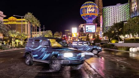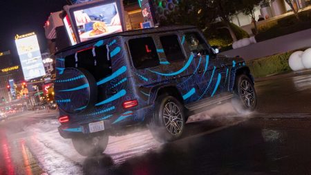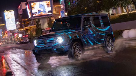 Αναλυτικότερα, εκτός από την εθιμοτυπική παρουσία ενός καμουφλαρισμένου πρωτότυπου στην τεχνολογική έκθεση του CES, η γερμανική φρόντισε να φέρει μαζί της στο Las Vegas ουκ ολίγα πρωτότυπα τα οποία επιδόθηκαν σε μια επίδειξη… δεξιοτεχνίας στο διάσημο Las Vegas Strip, ένα τμήμα του οποίου η Mercedes έκλεισε προκειμένου να δείξει για μια ακόμα φορά μια ιδιαιτερότητα της ηλεκτρικής G-Class.