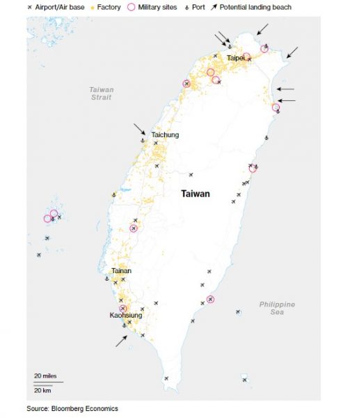 Η οικονομία της Ταϊβάν θα αποδεκατιστεί. Με βάση συγκρίσιμες πρόσφατες συγκρούσεις, το Bloomberg Economics εκτιμά ότι το πλήγμα στο ΑΕΠ θα είναι 40%. Ο πληθυσμός και η βιομηχανική βάση που είναι συγκεντρωμένα στην ακτή θα πρόσθεταν στο ανθρώπινο και οικονομικό κόστος.
