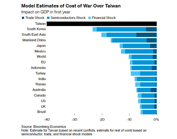 Η οικονομία της Ταϊβάν θα αποδεκατιστεί. Με βάση συγκρίσιμες πρόσφατες συγκρούσεις, το Bloomberg Economics εκτιμά ότι το πλήγμα στο ΑΕΠ θα είναι 40%. Ο πληθυσμός και η βιομηχανική βάση που είναι συγκεντρωμένα στην ακτή θα πρόσθεταν στο ανθρώπινο και οικονομικό κόστος.