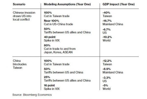 Το Bloomberg Economics έχει μοντελοποιήσει δύο σενάρια: μια κινεζική εισβολή που θα τραβήξει τις ΗΠΑ σε μια τοπική σύγκρουση και έναν αποκλεισμό που θα αποκόψει την Ταϊβάν από το εμπόριο με τον υπόλοιπο κόσμο. Μια σειρά μοντέλων χρησιμοποιείται για την εκτίμηση των επιπτώσεων στο ΑΕΠ, λαμβάνοντας υπόψη το πλήγμα στην προσφορά ημιαγωγών, τη διαταραχή της ναυτιλίας στην περιοχή, τις εμπορικές κυρώσεις και τους δασμούς, καθώς και τις επιπτώσεις στις χρηματοπιστωτικές αγορές.