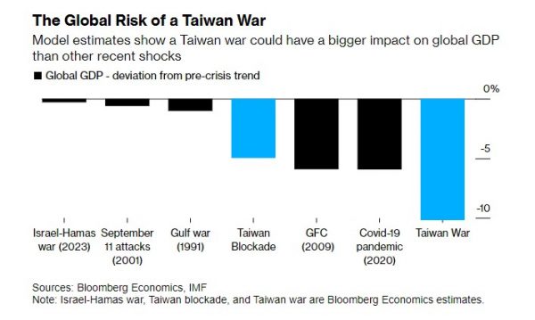 Ο πόλεμος για την Ταϊβάν θα είχε τεράστιο κόστος σε αίμα και χρήμα σύμφωνα με το Bloomberg που ακόμη και οι πιο δυσαρεστημένοι με το status quo έχουν λόγους να μην το διακινδυνεύσουν. Το Bloomberg Economics υπολογίζει το κόστος σε περίπου 10 τρισεκατομμύρια δολάρια, ποσό που αντιστοιχεί περίπου στο 10% του παγκόσμιου ΑΕΠ – επισκιάζοντας το πλήγμα από τον πόλεμο στην Ουκρανία, την πανδημία του Κόβιντ και την παγκόσμια χρηματοπιστωτική κρίση.