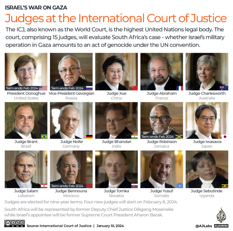 Το δικαστήριο αποτελείται από 15 δικαστές και στις συνεδριάσεις θα συμμετέχουν επίσης ένας δικαστής από τη Νότια Αφρική και ένας από το Ισραήλ. Aν τo δικαστήριo αποφασίσει να εφαρμόσει ένα προσωρινό μέτρο, αυτό θα θέσει νομικές υποχρεώσεις στο Ισραήλ. Οι αποφάσεις του δικαστηρίου είναι τελεσίδικες, αλλά όπως είπαμε δεν έχει εξουσία να τις εκτελέσει.
