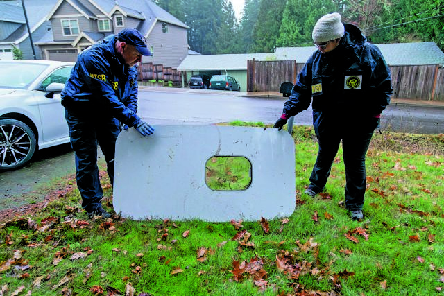 Ερευνητές του αμερικανικού Εθνικού Συμβουλίου Ασφάλειας Μεταφορών εξετάζουν το κομμάτι της ατράκτου του Boeing που έπεσε σε αυλή σπιτιού στο Πόρτλαντ