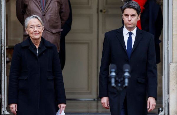 Η απερχόμενη πρωθυπουργός της Γαλλίας Elisabeth Borne και ο νεοδιορισθείς πρωθυπουργός της Γαλλίας Gabriel Attal όπως κατέφθασαν για την τελετή παράδοσης-παραλαβής στο ξενοδοχείο Matignon στο Παρίσι.