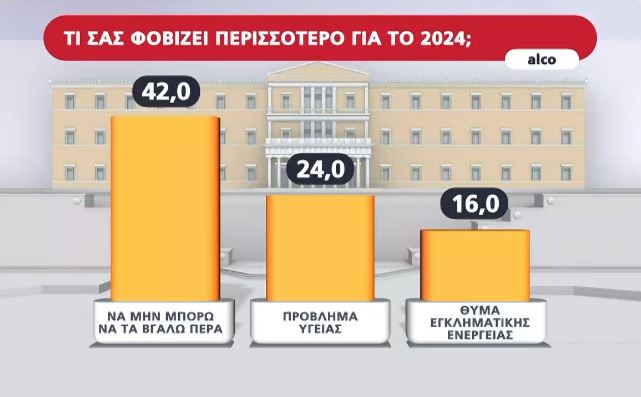 Την ίδια ώρα, η πλειοψηφία των Ελλήνων, σύμφωνα με πρόσφατη δημοσκόπηση, δηλώνει την απαισιοδοξία της για το 2024, ενώ σε ερώτηση ειδικά για τις προσδοκίες ως προς τα οικογενειακά οικονομικά, το 60% απάντησε ότι το 2024 θα είναι χειρότερο ή εξίσου κακό με το 2023.
