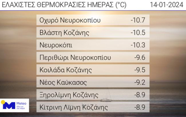Σύμφωνα με το δίκτυο αυτόματων μετεωρολογικών σταθμών του Εθνικού Αστεροσκοπείου Αθηνών / meteo.gr, οι οκτώ χαμηλότερες ελάχιστες θερμοκρασίες τις πρωινές ώρες της Κυριακής 14/01, καταγράφηκαν σε περιοχές της βόρειας Ελλάδας.