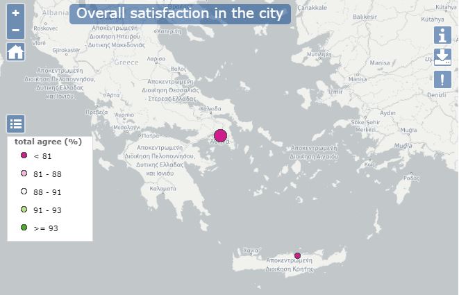Στην έρευνα της Ευρωπαϊκή Επιτροπή συμμετέχουν μόνο δύο ελληνικές πόλεις, η Αθήνα και το Ηράκλειο Κρήτης. Και οι δύο βρίσκονται χαμηλά στη λίστα (κάτω από τον μέσο όρο) με το Ηράκλειο να κερδίζει κατά κράτος στο ποσοστό ικανοποίησης με 81% έναντι 65% της Αθήνας.