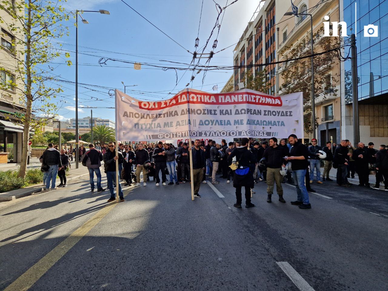 «Αποκλειστικά δημόσιες και δωρεάν σπουδές», έγραφε το πανό που κρατούν τα μέλη των φοιτητικών συλλόγων της Αθήνας, στην πορεία.