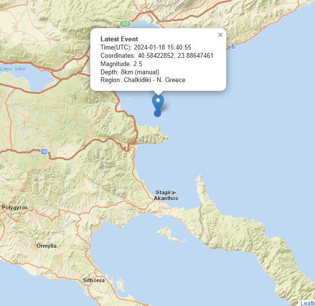 Ασθενής σεισμική δόνηση μεγέθους 2,5 βαθμών της κλίμακας Ρίχτερ σημειώθηκε στις 17:40 την Πέμπτη 18 Ιανουαρίου, στη Χαλκιδική.
