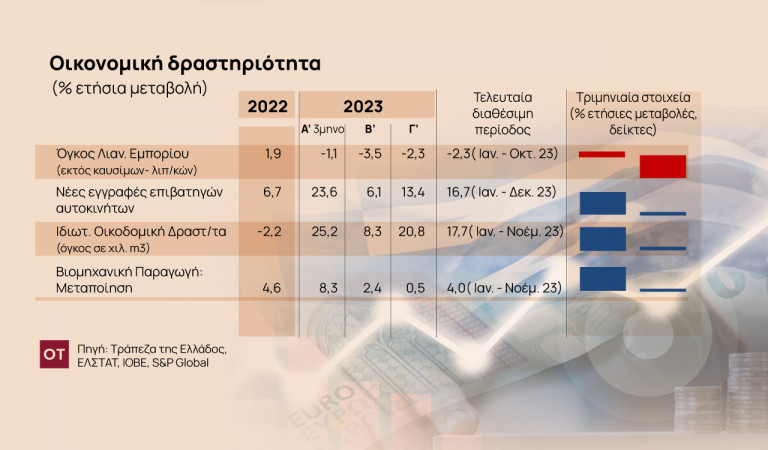 Από τα στοιχεία που επεξεργάστηκε ο ΟΤ παρουσιάζονται οι κλάδοι που έχουν επιβραδύνει τους ρυθμούς ανάπτυξης το 2023, εκείνοι που κινούνται θετικά, αλλά και όσοι έχουν περάσει σε αρνητικό πρόσημο βάσει των δεικτών οικονομικής συγκυρίας.