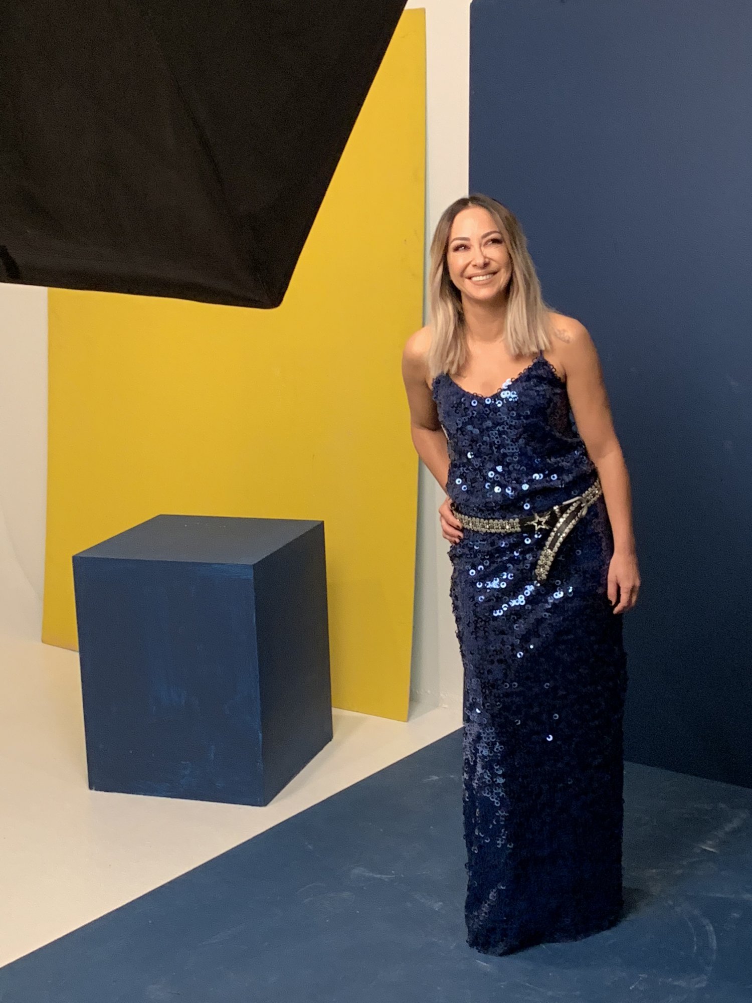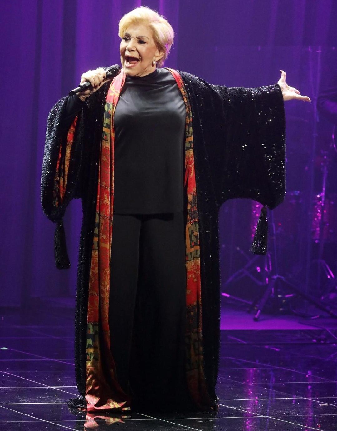 Το statement βελούδινο κιμονό της με παγιέτες, ένα ρούχο τόσο επιβλητικό όσο και η ίδια.Έχει φοδραριστεί με ένα μεταξωτό vintage ύφασμα -που το αγάπησε από την πρώτη στιγμή – και τελευταία πινελιά είναι οι χειροποίητες φούντες με χάντρες και παγιέτες που συμπληρώνουν αυτό το μοναδικό ρούχο, το οποίο σχεδιάστηκε και κατασκευάστηκε αποκλειστικά για εκείνη.