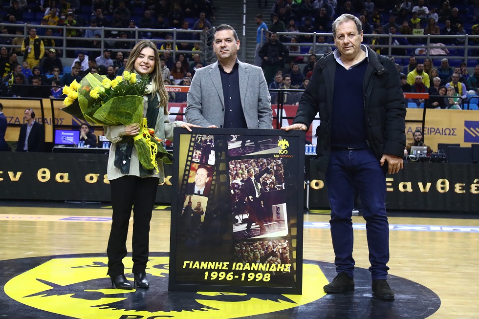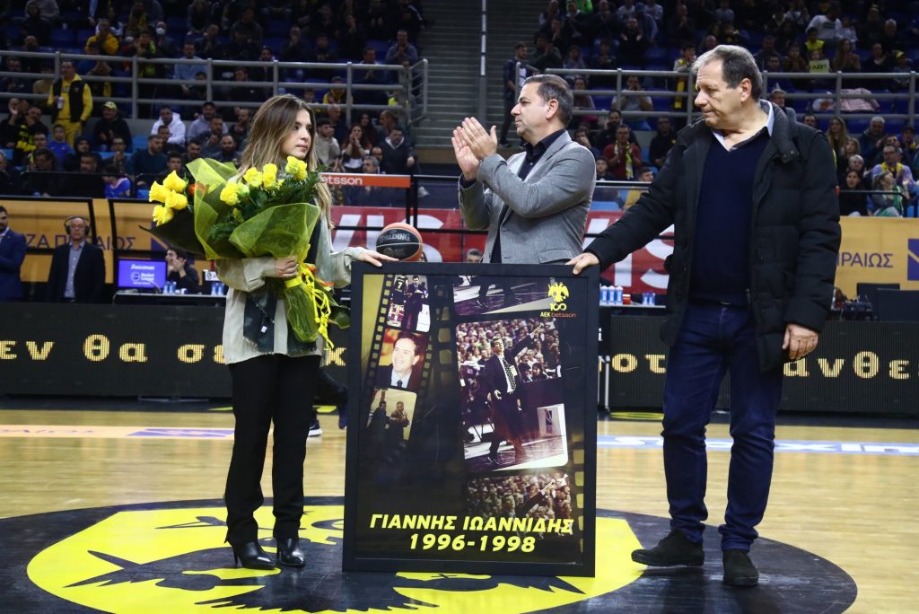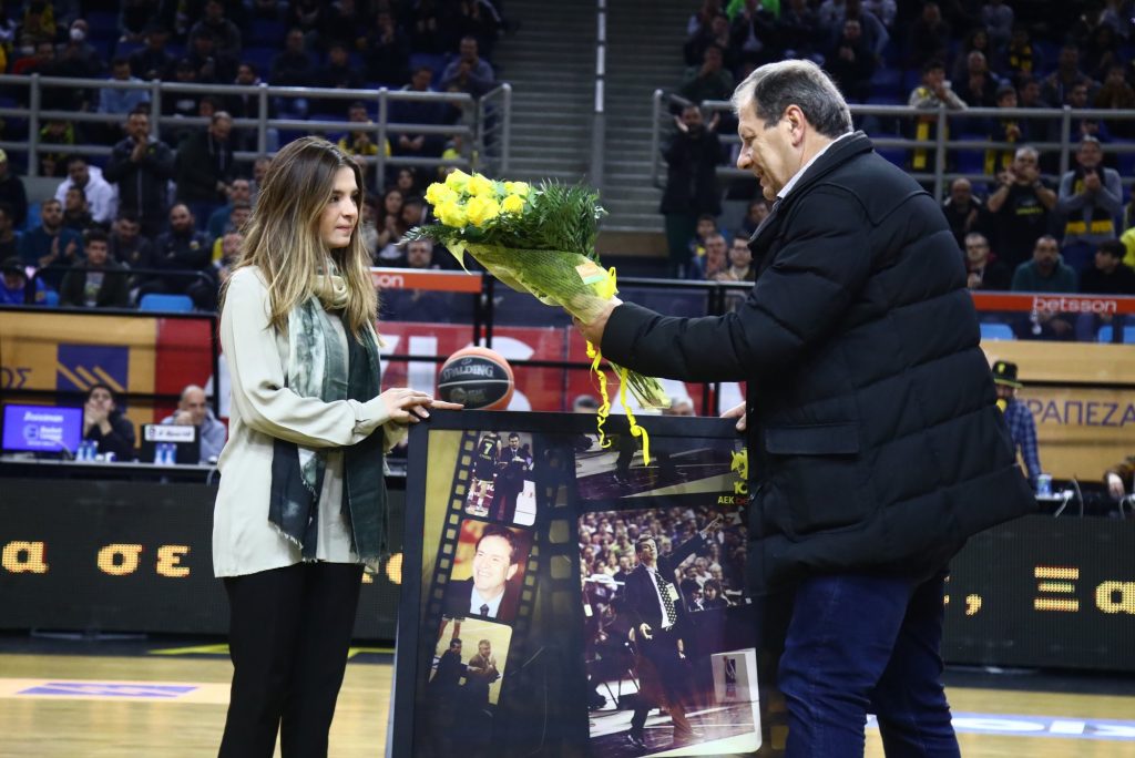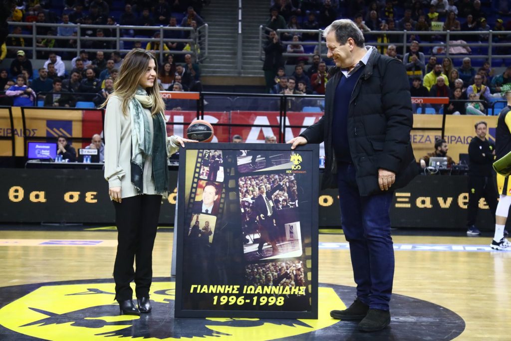 Πριν το τζάμπολ στην αναμέτρηση με την ομάδα της Θεσσαλονίκης ο Μάκης Αγγελόπουλος έδωσε στη σύζυγο και την κόρη του Ιωαννίδη ένα κάδρο με στιγμές από την παρουσία του στην ΑΕΚ την οποία οδήγησε μέχρι τον τελικό της Euroleague.