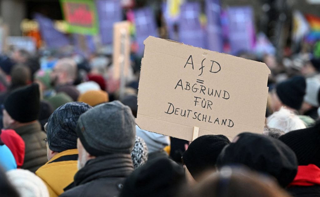 «AFD = η άβυσσος για τη Γερμανία» αναγράφεται στο πλακάτ διαδηλωτή, στις κινητοποιήσεις κατά του δεξιού εξτρεμισμού, στις 19 Ιανουαρίου, στο Αμβούργο