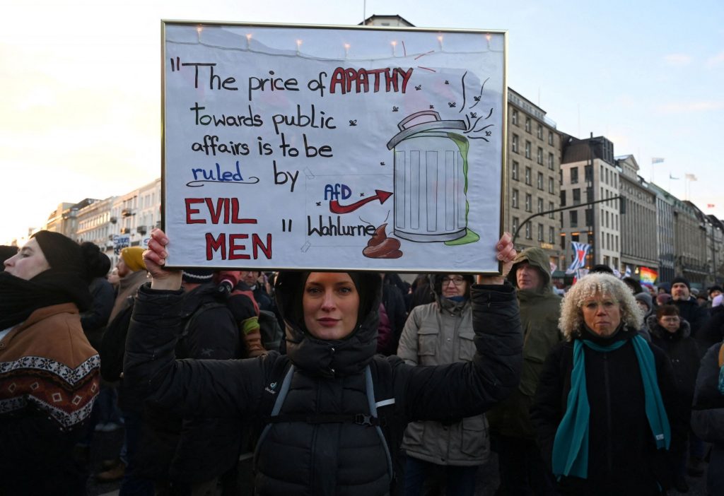 «Tο τίμημα της απάθειας στις δημόσιες υποθέσεις είναι να κυβερνάσαι από διαβολικούς ανθρώπους», αναγράφεται σε άλλο ένα πλακάτ στις διαδηλώσεις κατά του AfD