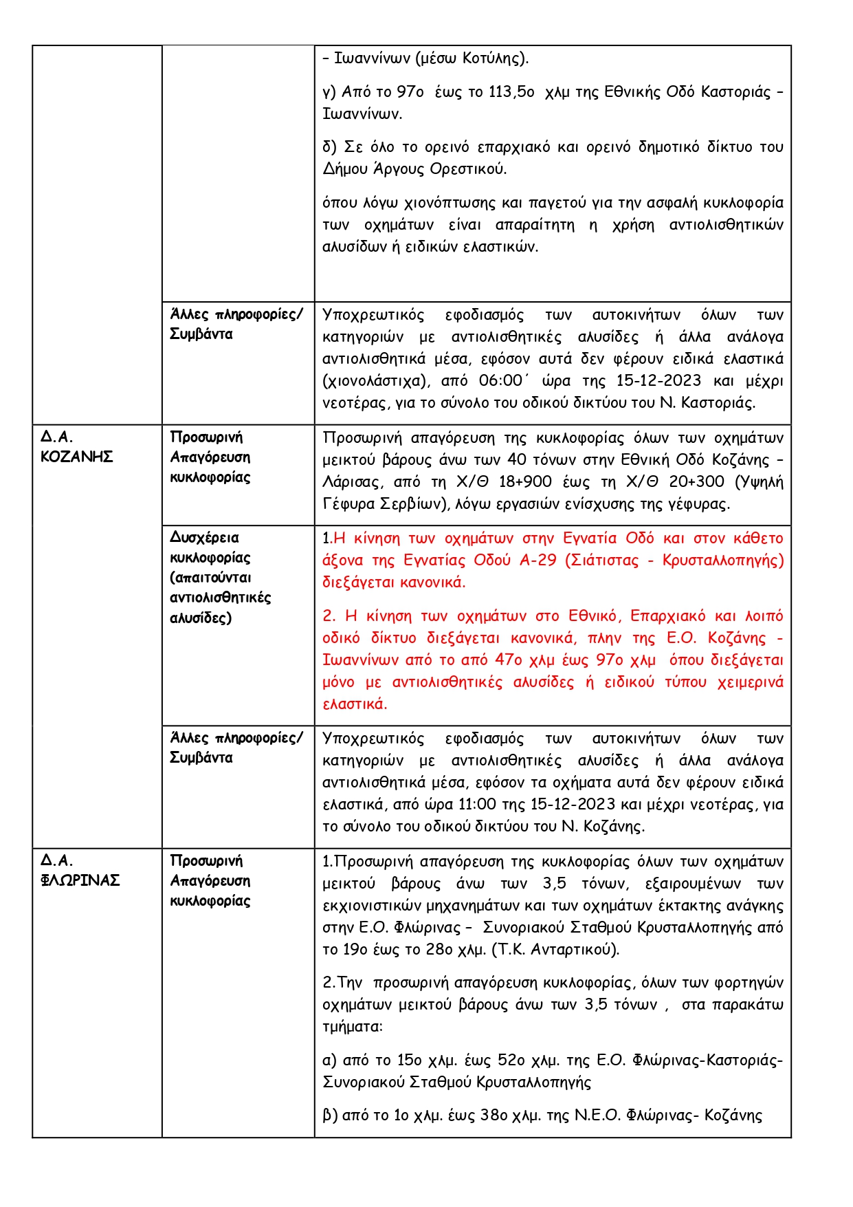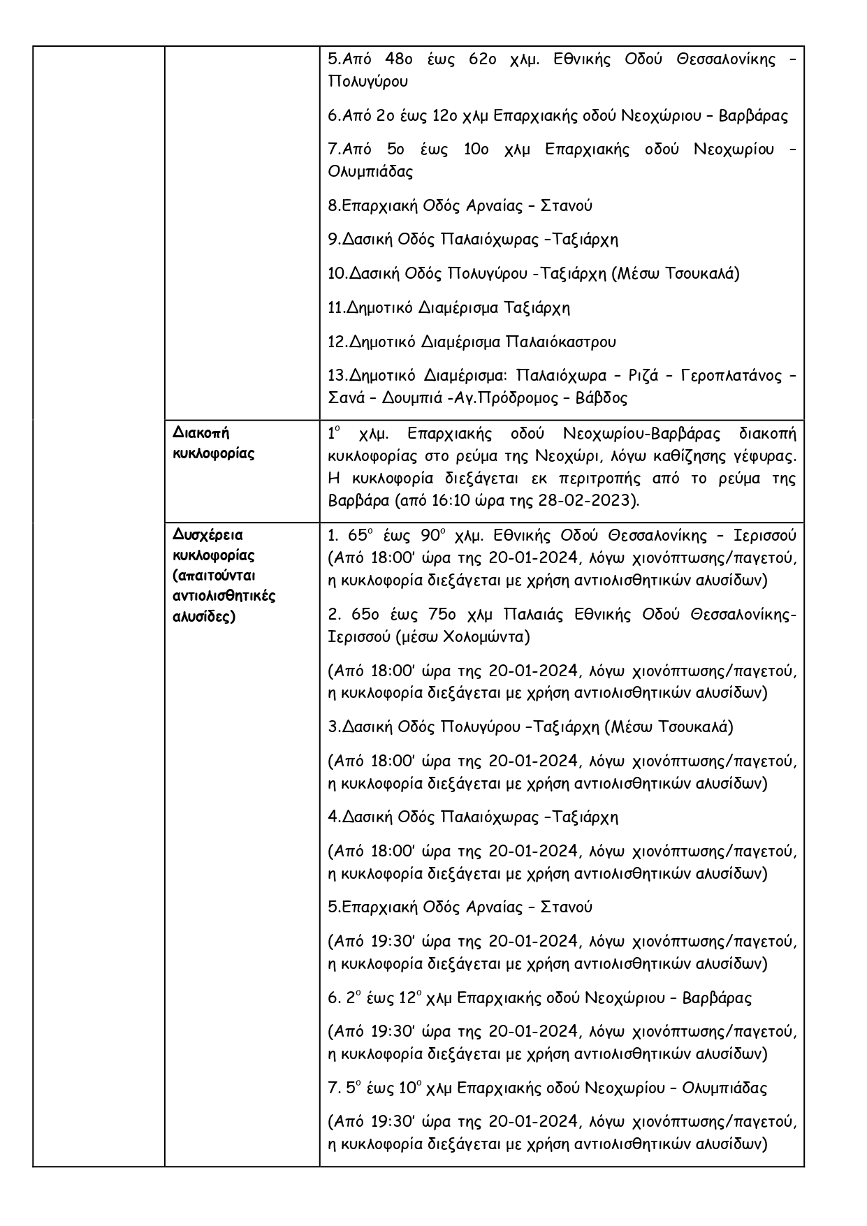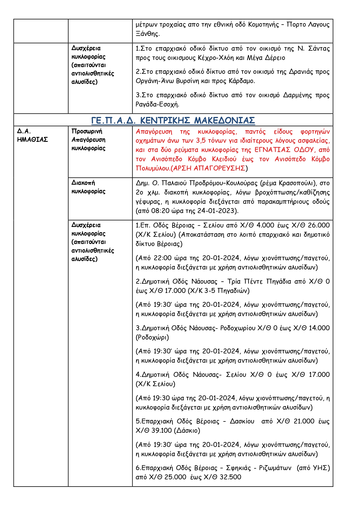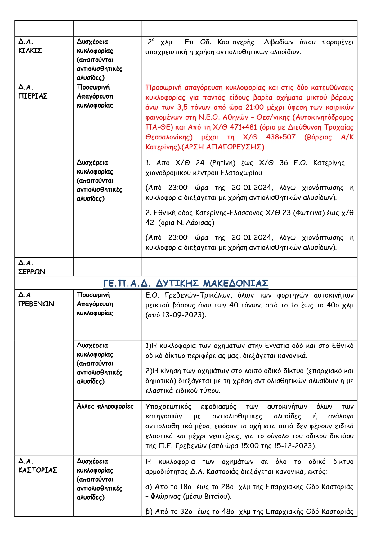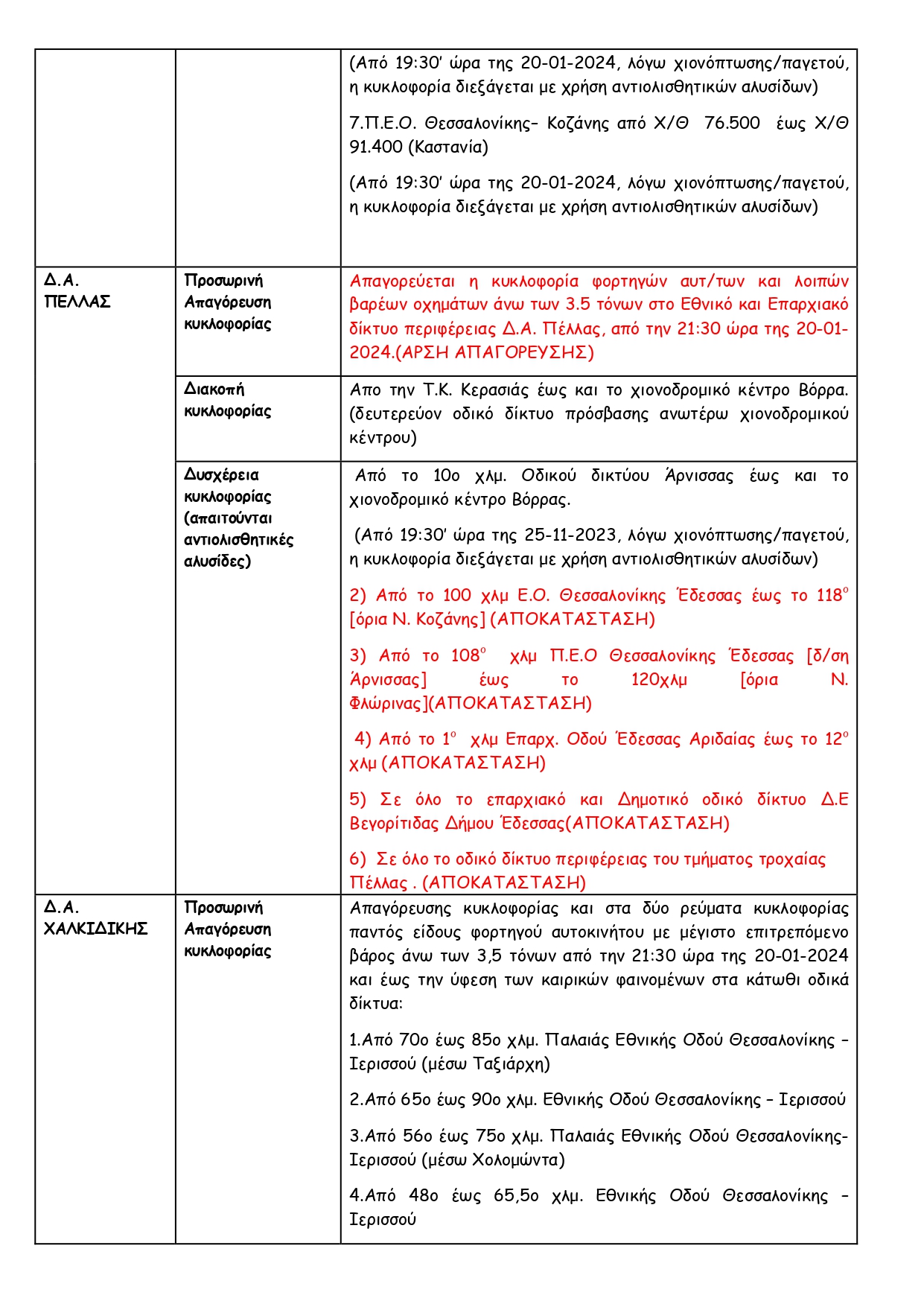 Σύμφωνα με απόφαση της Διεύθυνσης Αστυνομίας Χαλκιδικής, λόγω των συνεχιζόμενων δυσμενών καιρικών συνθηκών, απαγορεύεται προσωρινά η κυκλοφορία παντός είδους φορτηγού οχήματος με μέγιστο επιτρεπόμενο βάρος άνω των 3,5 τόνων, στα εξής οδικά σημεία:
