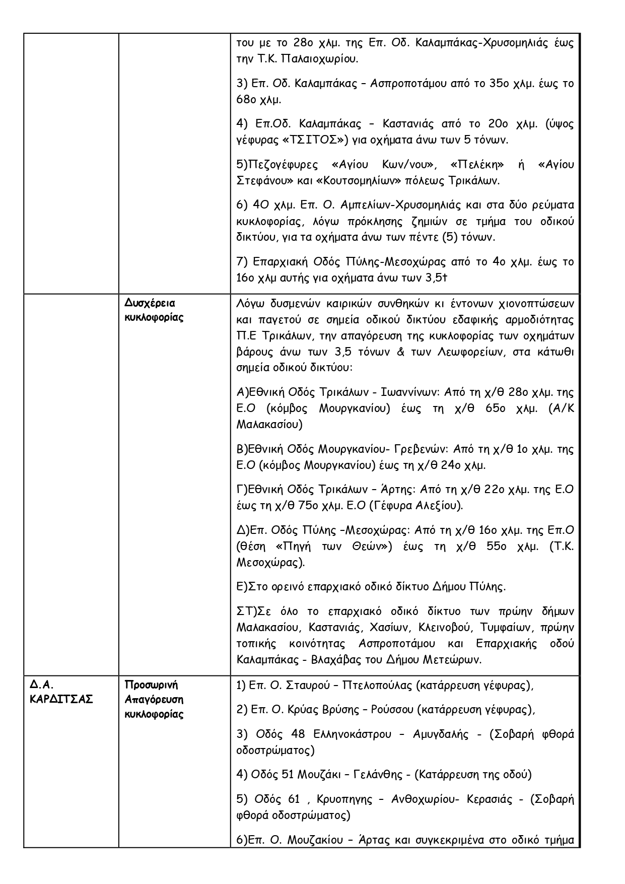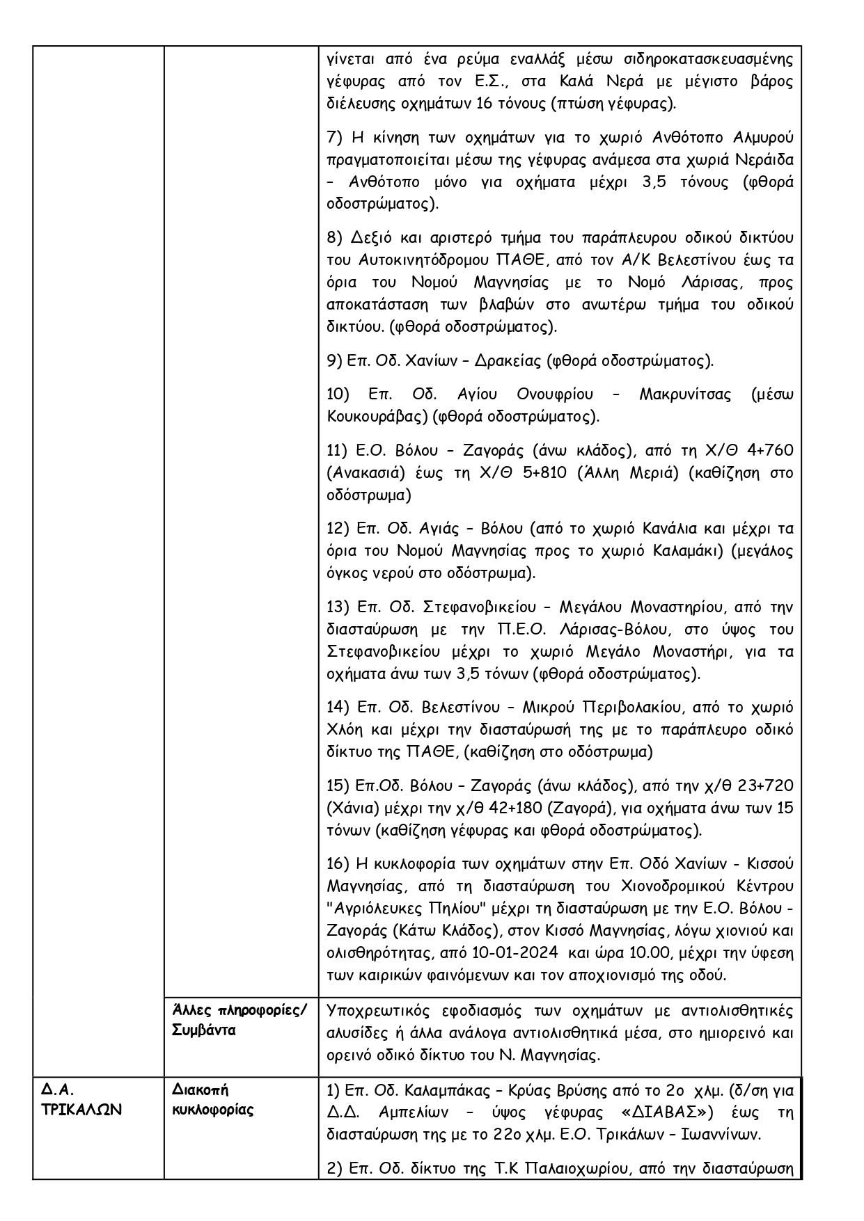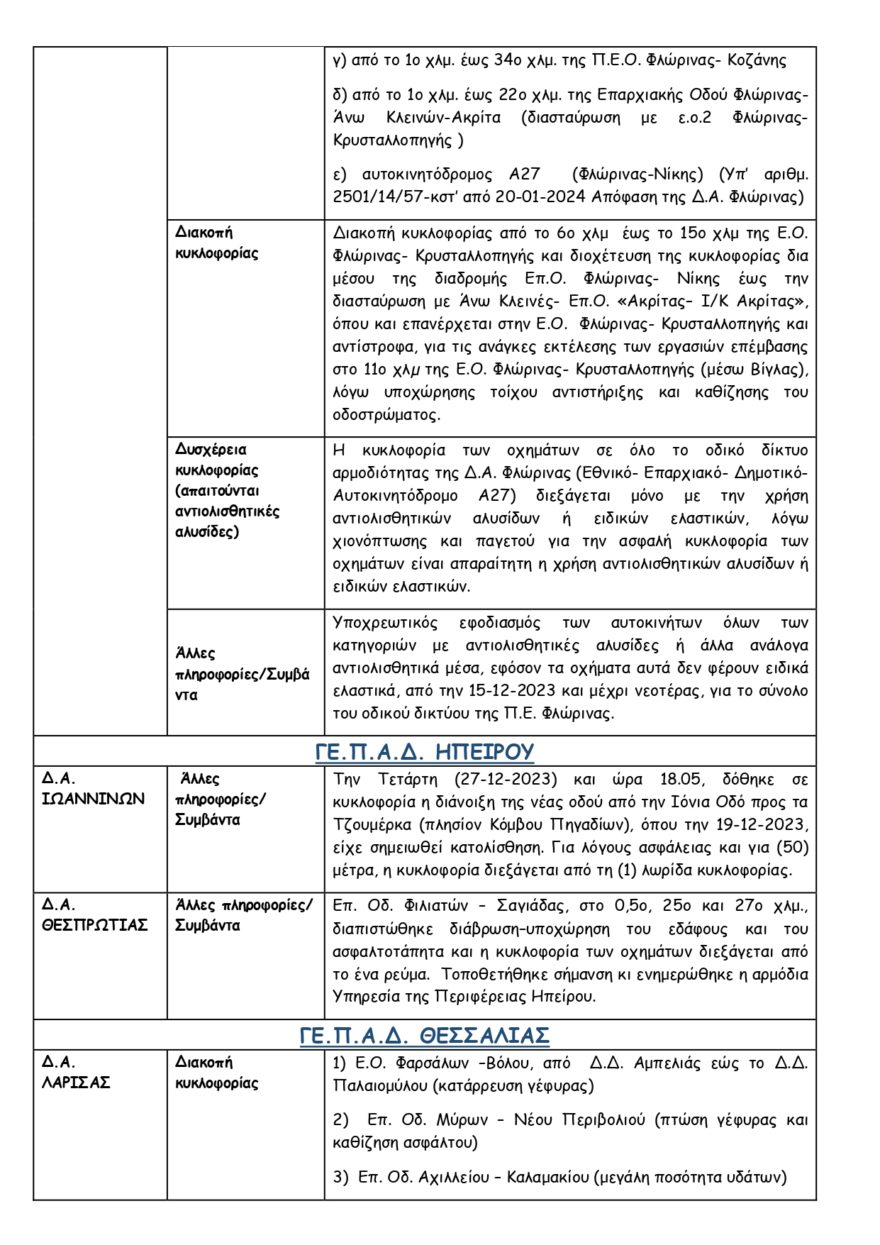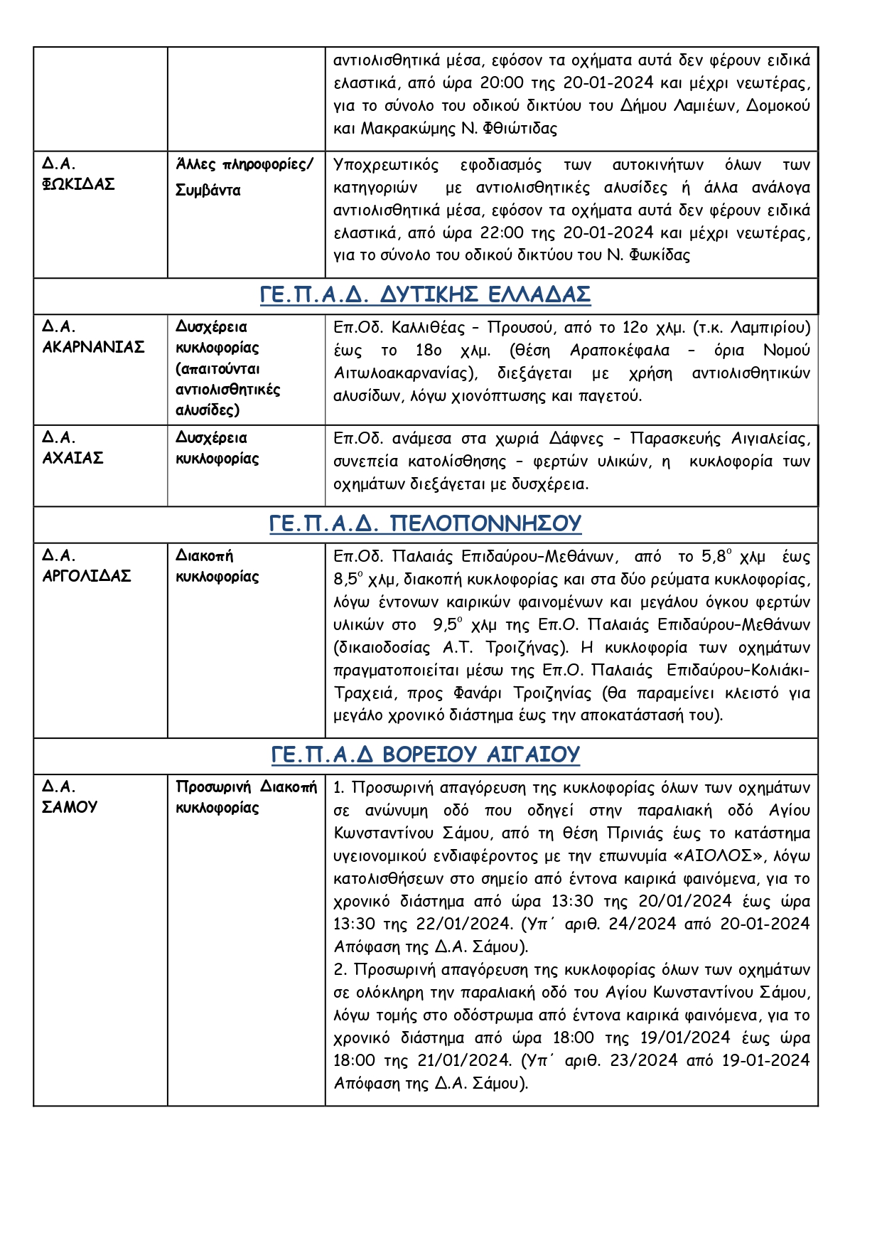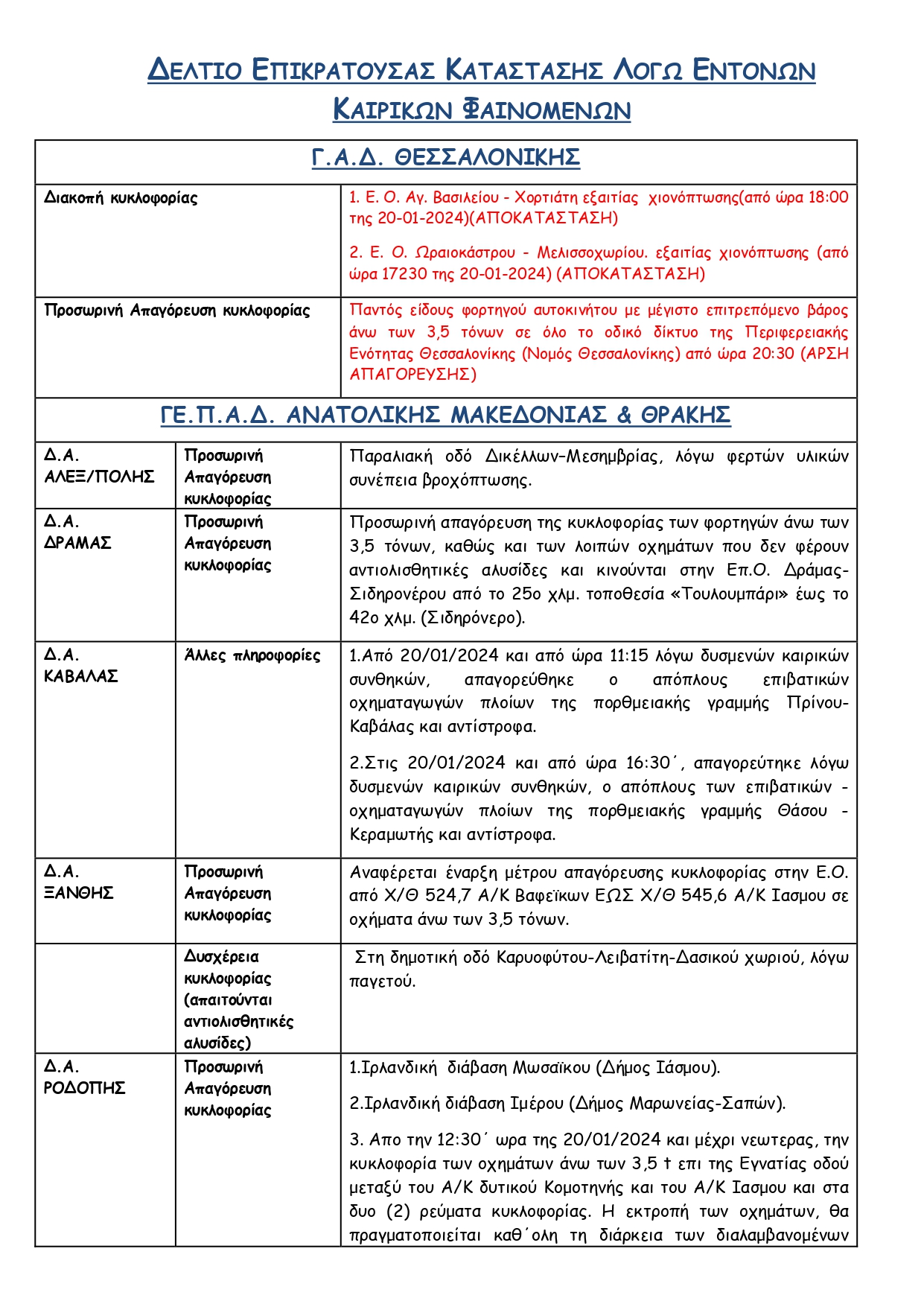 Σύμφωνα με απόφαση της Διεύθυνσης Αστυνομίας Χαλκιδικής, λόγω των συνεχιζόμενων δυσμενών καιρικών συνθηκών, απαγορεύεται προσωρινά η κυκλοφορία παντός είδους φορτηγού οχήματος με μέγιστο επιτρεπόμενο βάρος άνω των 3,5 τόνων, στα εξής οδικά σημεία: