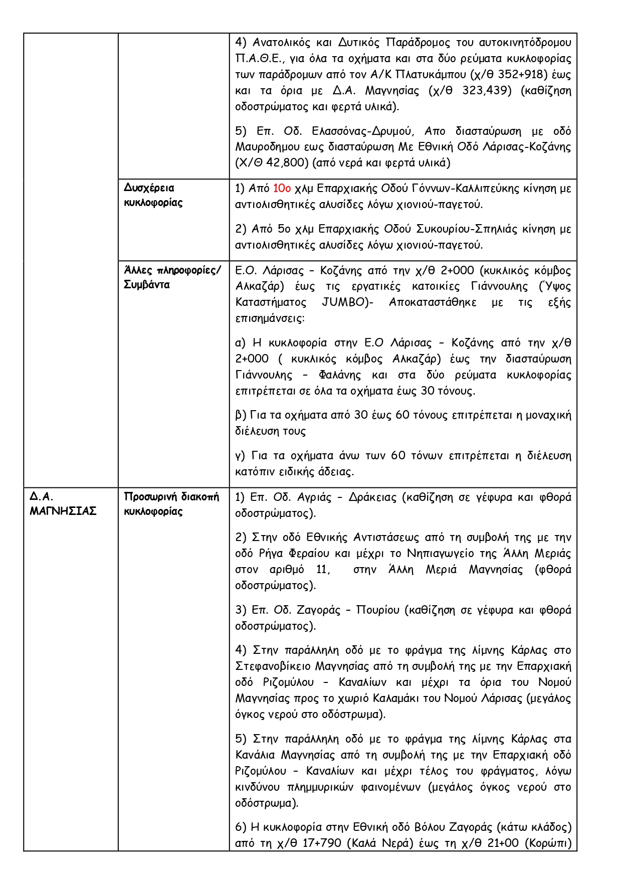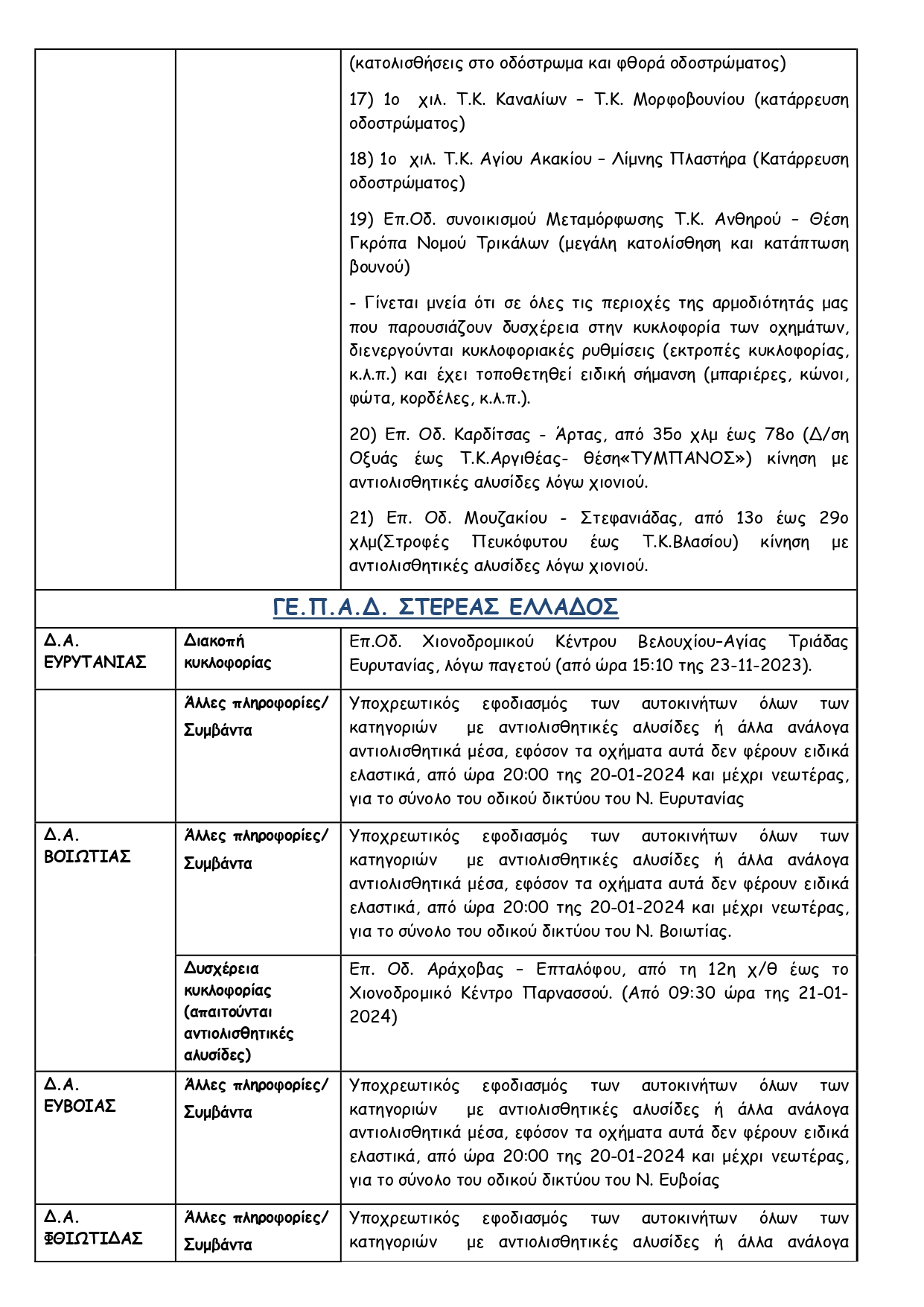 Επίσης ανακοινώνεται ότι, η κυκλοφορία των οχημάτων διεξάγεται αποκλειστικά με τη χρήση αντιολισθητικών αλυσίδων, άλλων αντιολισθητικών μέσων ή με ειδικά ελαστικά (χιονολάστιχα), δηλαδή εκείνα που φέρουν την ειδική σήμανση του «αλπικού» συμβόλου και χαρακτηριστικό Μ+S, στα εξής οδικά σημεία: