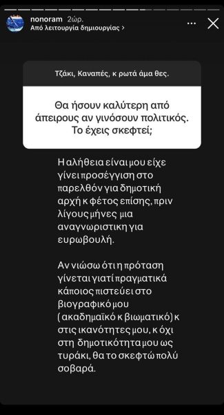 «Η αλήθεια είναι ότι μου είχε γίνει προσέγγιση στο παρελθόν για Δημοτική Αρχή και φέτος επίσης, μια αναγνωριστική για Ευρωβουλή. Αν νιώσω ότι η πρόταση γίνεται γιατί πραγματικά κάποιος πιστεύει στο βιογραφικό μου (ακαδημαϊκό και βιωματικό) και στις ικανότητές μου και όχι στη δημοτικότητά μου ως τυράκι, θα το σκεφτώ πολύ σοβαρά», απάντησε η Ελεονώρα Μελέτη.