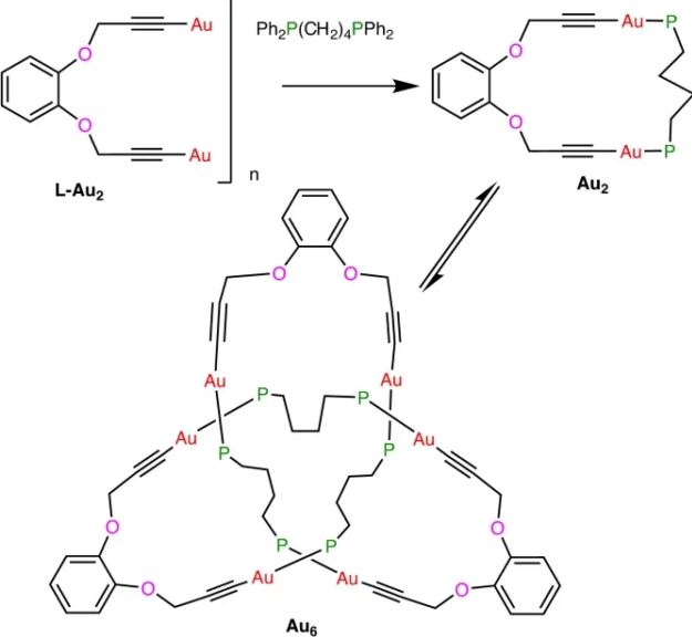 H αλυσίδα περιέχει άνθρακα, χρυσό, υδρογόνο και φωσφόρο και έχει χημικό τύπο [Au6{1,2-C6H4(OCH2CC)2} 3{Ph2P(CH2)4PPh2}3].