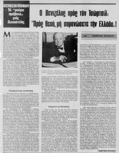 *Άρθρο του Γεωργίου Ρούσσου, που έφερε τον τίτλο «Ο Βενιζέλος προς τον Τσώρτσιλ: Προς Θεού, μη σαβανώσετε την Ελλάδα» και είχε δημοσιευτεί στον «Ταχυδρόμο» στις 12 Οκτωβρίου 1973.