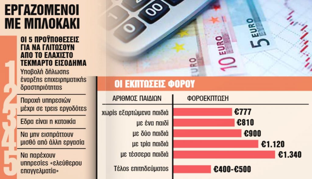 Οσοι εργαζόμενοι με μπλοκάκι πληρούν τις πέντε προϋποθέσεις θα απαλλαγούν από το τεκμήριο εισοδήματος και θα εξασφαλίσουν έκπτωση φόρου που ανέρχεται σε777 ευρώ για τον φορολογούμενο χωρίς εξαρτώμενα τέκνα, σε 810 ευρώ για τον φορολογούμενο μεένα παιδί, 900 ευρώ για δύο παιδιά, κατά 1.120 ευρώ για φορολογούμενους με τρία παιδιά και κατά 1.340 ευρώ για φορολογούμενους με τέσσερα εξαρτώμενα τέκνα.
