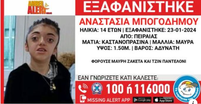 Η ανήλικη Αναστασία Μπογοδήμου εξαφανίστηκε, στις 23/01/2024, από την περιοχή του Πειραιά.