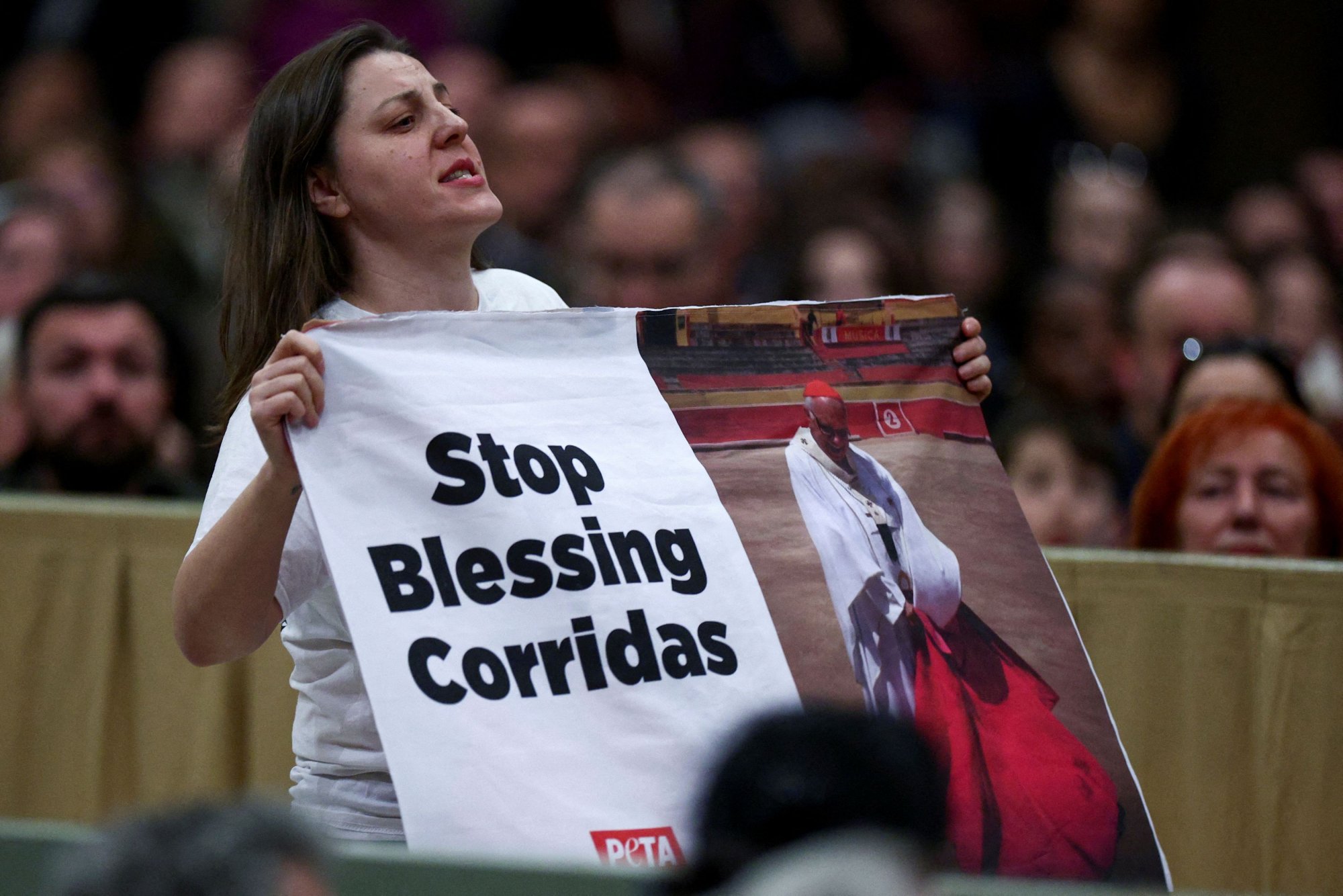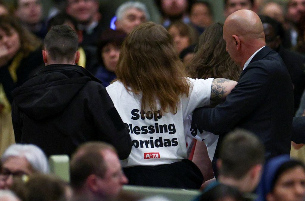 Φωνάζοντας συνθήματα και κρατώντας πλακάτ κατά των ταυρομαχιών, δυο ακτιβίστριες της PETA («Άνθρωποι για την Ηθική Μεταχείριση των Ζώων») διέκοψαν την Πέμπτη (25/1) την Ακολουθία του Εσπερινού στη βασιλική του Αγίου Παύλου εκτός των τειχών, στη Ρώμη, στην οποία χοροστατούσε ο πάπας Φραγκίσκος.